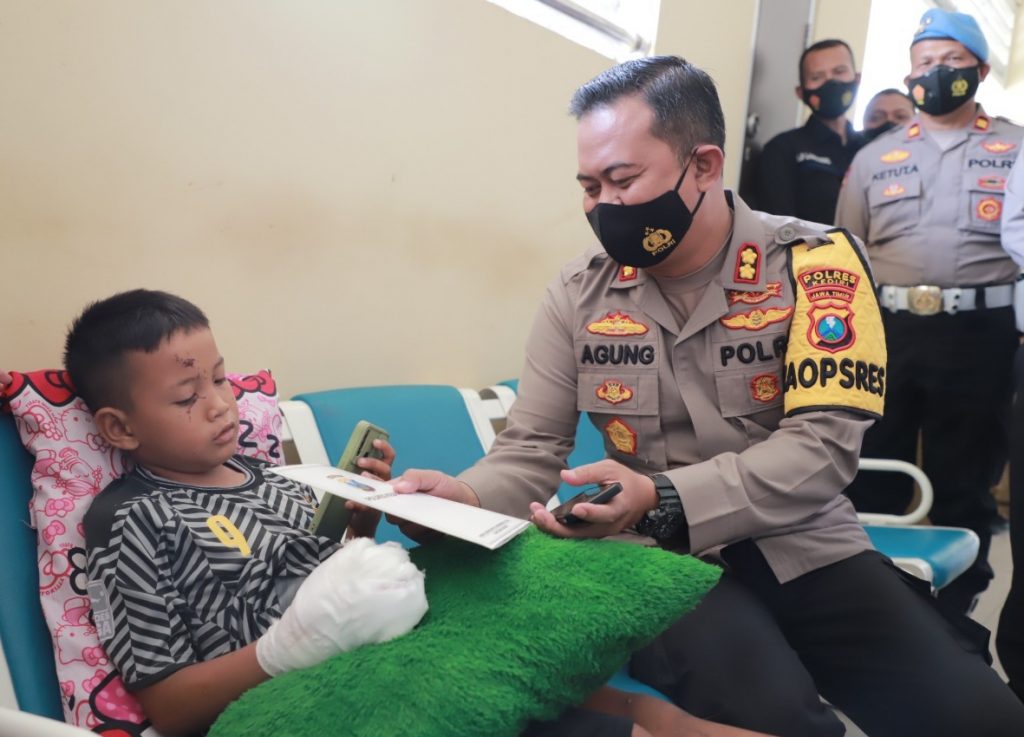 Kapolres Kediri AKBP Agung Setyo Nugroho menjenguk langsung korban letusan petasan, DAM (9), asal Kecamatan Kandat Kabupaten Kediri di RSUD Simpang Lima Gumul (SLG),