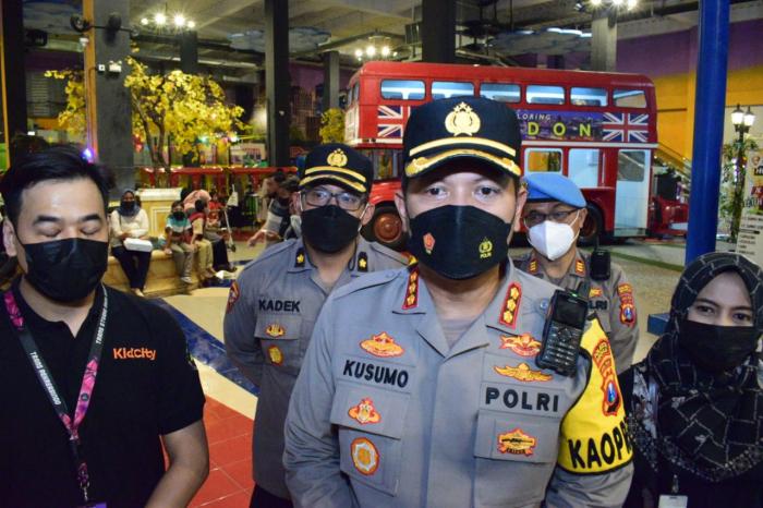 Untuk memastikan protokol kesehatan, seperti pemakaian masker dilaksanakan betul baik oleh pihak pengelola dan masyarakat, Kapolresta Sidoarjo Kombes Pol. Kusumo Wahyu Bintoro mengecek mal dan wahana bermain di Transmart, Sabtu (7/5/2022) malam.
