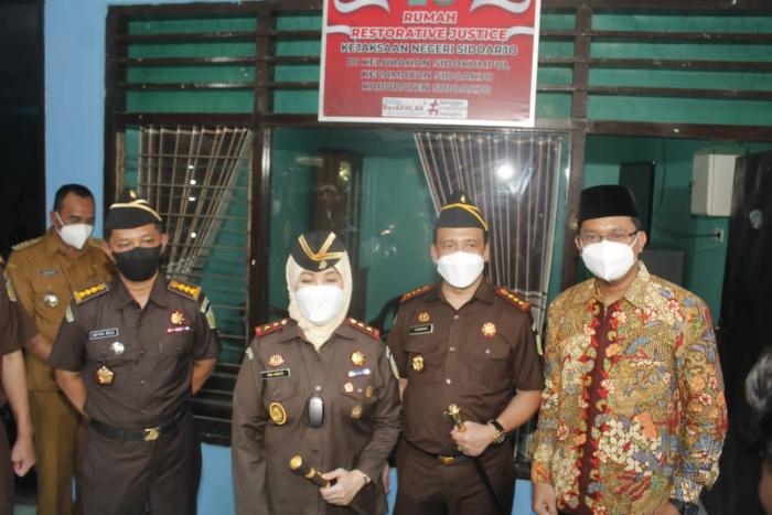 Pagi tadi, rumah restorative justice secara simbolis di resmikan oleh Kepala Kejaksaan Tinggi Jawa Timur Dr. Mia Amiati SH,MH di kantor Kelurahan Sidokumpul Kecamatan Sidoarjo, Senin, (6/6). Forkopimda Sidoarjo hadir dalam peresmian itu. Antara lain Bupati Sidoarjo H. Ahmad Muhdlor S.IP, Kepala Kejaksaan Negeri Sidoarjo Achmad Muhdhor, Ketua DPRD Sidoarjo H. Usman serta Kapolresta Sidoarjo Kombes Pol Kusumo Wahyu Bintoro dan Dandim 0816 Sidoarjo Letkol Inf Masarum Djatilaksono.