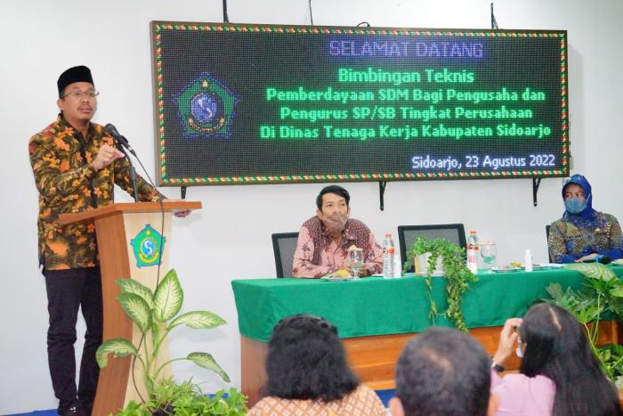 Sidoarjo, Kharismanews.id – Bupati Sidoarjo H.Ahmad Muhdlor Ali, S.IP membuka acara Bimbingan Teknis/Bimtek Pemberdayaan SDM Bagi Pengusaha dan Pengurus SP/SB Tingkat Perusahaan di aula Dinas Tenaga Kerja Kabupaten Sidoarjo, Selasa (23/8). Kegiatan yang digelar Dinas Tenaga Kerja Kabupaten Sidoarjo tersebut bertujuan untuk memberdayakan Sumber Daya Manusia bagi pengusaha dan pengurus pekerja di tingkat perusahaan yang ada di Kabupaten Sidoarjo.