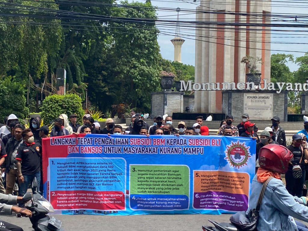 “Kami dari kelompok Indonesia Timur Bersatu akan turut mengawasi penyaluran BLT dan Bansos lebih tepat sasaran. Karena kenaikan harga BBM bersubsidi juga dapat menghemat APBN, selama ini BBM menghabiskan dana 502 Triliun dari awal tahun 2022, yang mana ternyata tidak tepat sasaran karena banyak mobil mewah yang menggunakan BBM bersubsidi, sehingga alternatif pengalihan subsidi BBM menjadi BLT dan Bansos merupakan langkah tepat,” seru Alan, salah satu orator aksi ITB di depan Monumen Jayandaru.