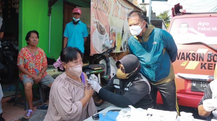 Kapolresta Sidoarjo Kombes Pol. Kusumo Wahyu Bintoro, meninjau langsung layanan gerai vaksinasi Covid-19 booster keliling di lokasi Pasar Kaget Waru. Ia mengapresiasi animo warga yang begitu besar terhadap upaya percepatan vaksinasi.