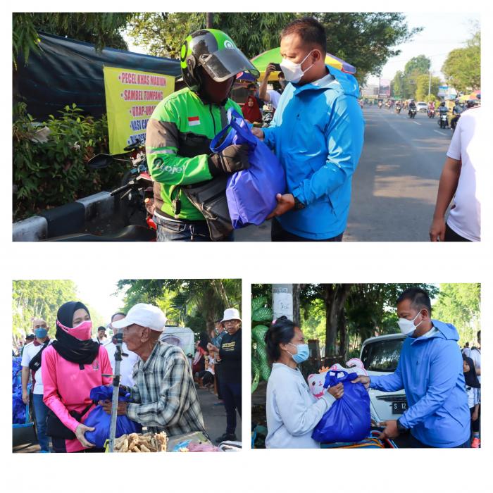 “Pak berikut paket sembako dari kami, semoga bermanfaat dan ketika berkendara di jalan raya jangan lupa mematuhi peraturan lalu lintas ya,” ucap Kapolresta Sidoarjo Kombes Pol. Kusumo Wahyu Bintoro saat memberikan paket sembako ke pengendara ojek online di depan Masjid Agung.