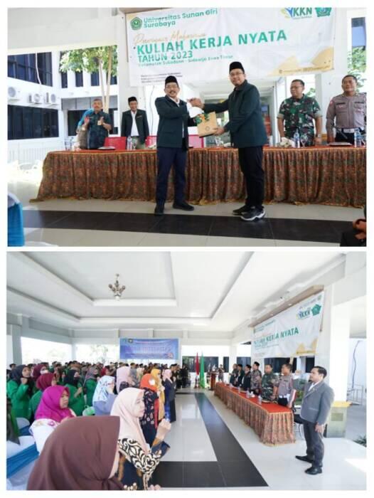 Sidoarjo, Kharismanews.id – Kabupaten Sidoarjo kembali menjadi jujugan mahasiswa yang akan melaksanakan KKN (Kuliah Kerja Nyata). Kali ini ada sebanyak 277 mahasiswa Universitas Sunan Giri/Unsuri Surabaya yang akan mengimplementasikan ilmunya ditengah-tengah masyarakat Sidoarjo. Mereka akan melakukan kegiatan di Kecamatan Sukodono. Selasa pagi, (1/8), mereka dilepas Bupati Sidoarjo H. Ahmad Muhdlor Ali S. IP di Kantor Kecamatan Sukodono. Dengan penuh semangat, Bupati Sidoarjo yang akrab disapa Gus Muhdlor itu melepas peserta kegiatan KKN yang bertajuk “Bersama masyarakat membangun jiwa entrepreneurship”. Kegiatan KKN mahasiswa Unsuri Surabaya akan berlangsung selama 1 bulan penuh.