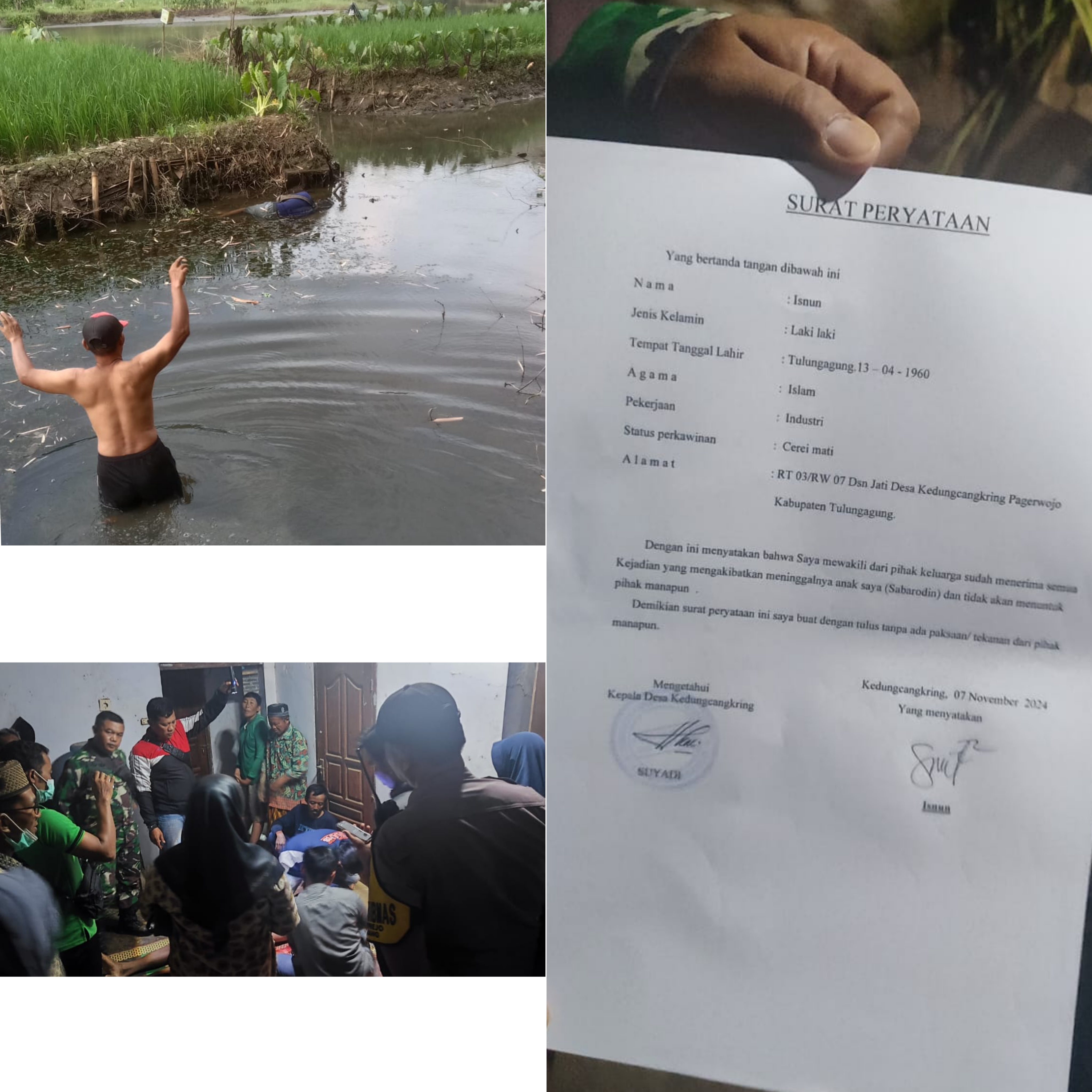 Tulungagung, Kharismanews.id – Seorang pemuda bernama Sabarodin (18) asal Dusun Jati, Desa Kedungcangkring, Kecamatan Pagerwojo, Kabupaten Tulungagung, ditemukan meninggal dunia setelah tercebur di Sungai Bodeng, Dusun Plenggrong, Desa Tiudan, Kecamatan Gondang. Peristiwa ini terjadi pada Kamis, 11 November 2024, sekitar pukul 16.00 WIB.