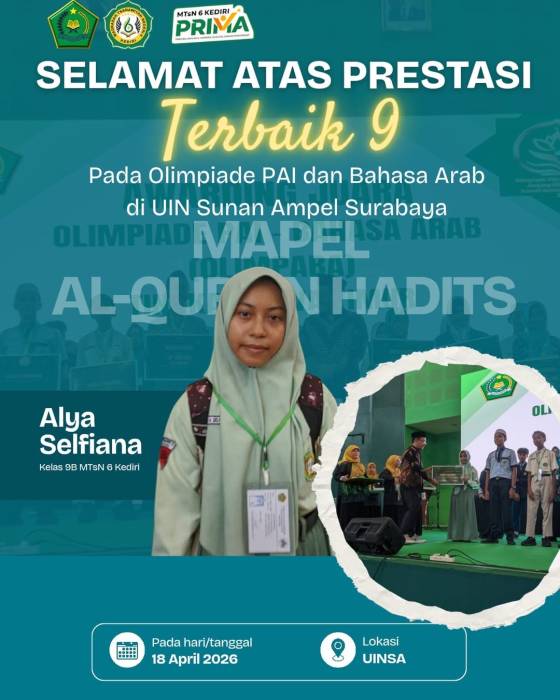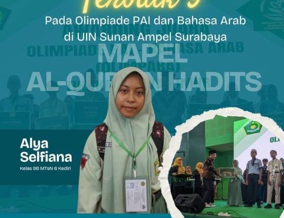 Kediri, Kharismanews.id – Prestasi membanggakan kembali ditorehkan oleh siswa madrasah. Alya Selfiana, siswi kelas 9B MTsN 6 Kediri, berhasil meraih posisi **Terbaik 9** dalam ajang Olimpiade Pendidikan Agama Islam (PAI) dan Bahasa Arab yang diselenggarakan di UIN Sunan Ampel Surabaya.