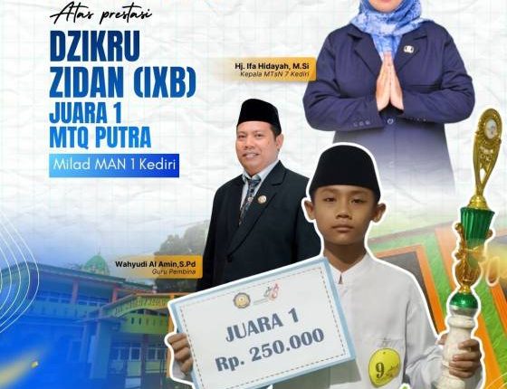 Kediri, Kharismanews.id – Prestasi gemilang kembali ditorehkan oleh siswa MTsN 7 Kediri. Dzikiru Zidan, siswa kelas IX-B, berhasil meraih Juara 1 Musabaqah Tilawatil Qur’an (MTQ) Putra dalam rangka peringatan Milad MAN 1 Kediri. Capaian ini menjadi kebanggaan tersendiri bagi keluarga besar madrasah.