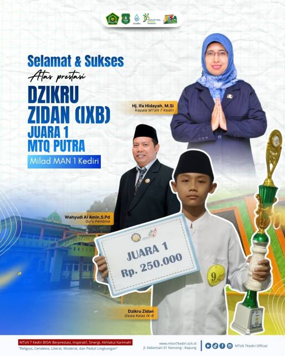 “Alhamdulillah, prestasi ini menjadi bukti bahwa siswa MTsN 7 Kediri mampu berprestasi tidak hanya di bidang akademik, tetapi juga dalam bidang keagamaan. Semoga ini menjadi motivasi bagi siswa lainnya untuk terus mengembangkan potensi diri,” ujarnya.